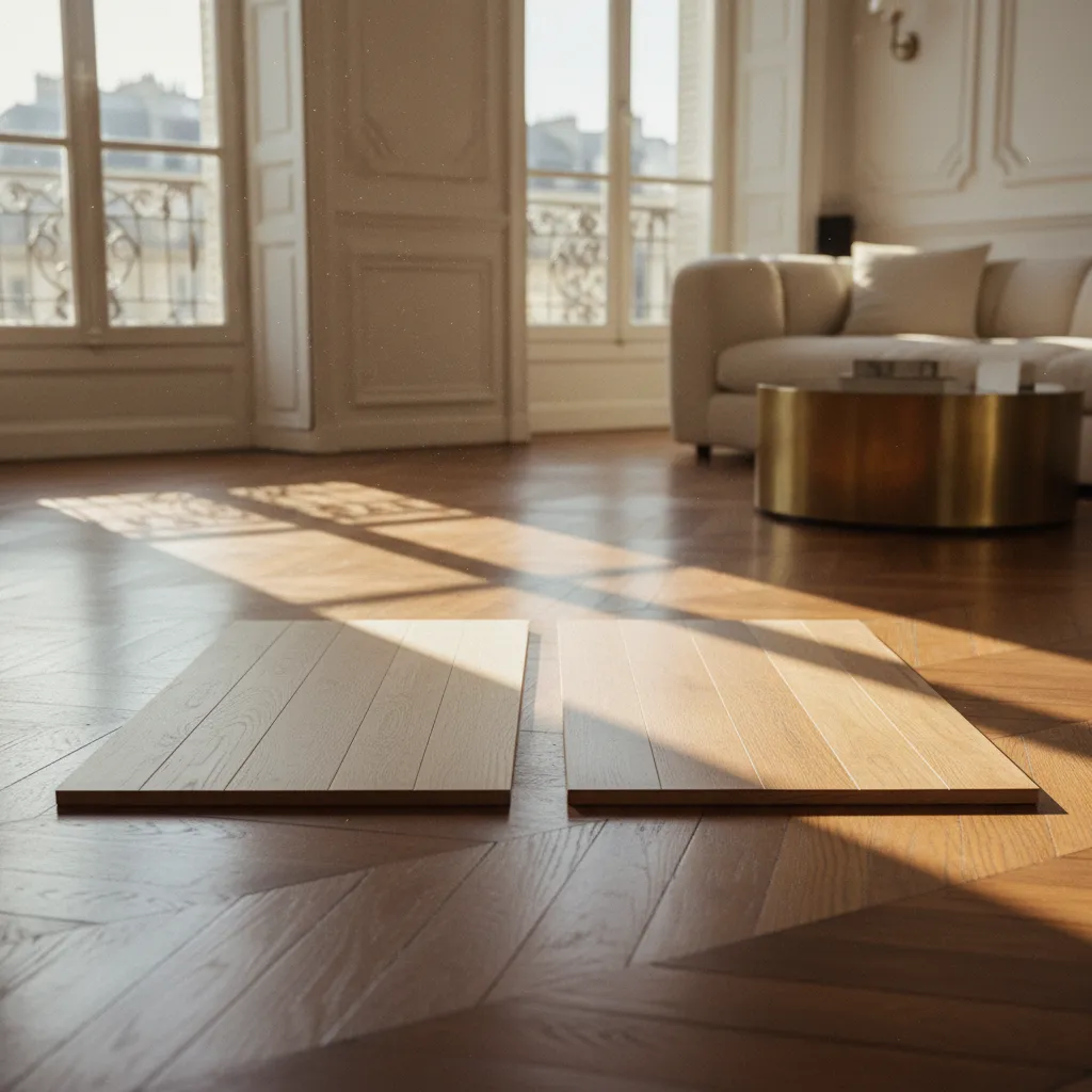 Pour le choix des teintes, je vous recommande de lire mon article sur les nuances qui vieillissent bien : les mêmes principes s’appliquent au parquet. Les teintes trop blanches jaunissent, les teintes trop foncées montrent chaque rayure et grain de poussière.