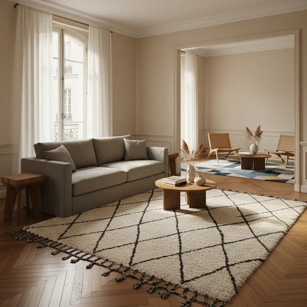 Pour un salon qui mêle plusieurs fonctions (repas, détente, bureau), je conseille souvent de superposer deux tapis : un grand tapis moderne neutre en base et un plus petit berbère sur la zone canapé. Cela permet de zoner l’espace sans cloisonner, une technique que j’utilise aussi dans les projets de petits salons.